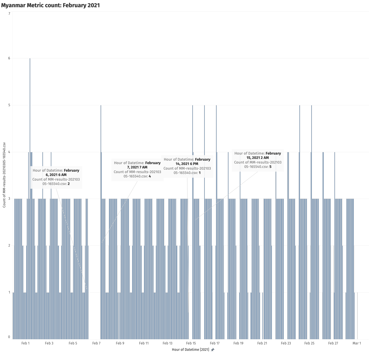 When a second Internet outage occurred in Myanmar a few days later (on 6th February 2021), Mozilla telemetry provided a strong signal as we observe the complete absence of metrics during that period.