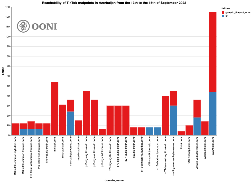 The OONI Probe testing of www.tiktok.com on 5 networks in Azerbaijan between 13th to 15th September 2022 can be further examined through the following chart, which shows that its testing consistently presented generic_timeout_errors on at least 3 networks by 15th September 2022.