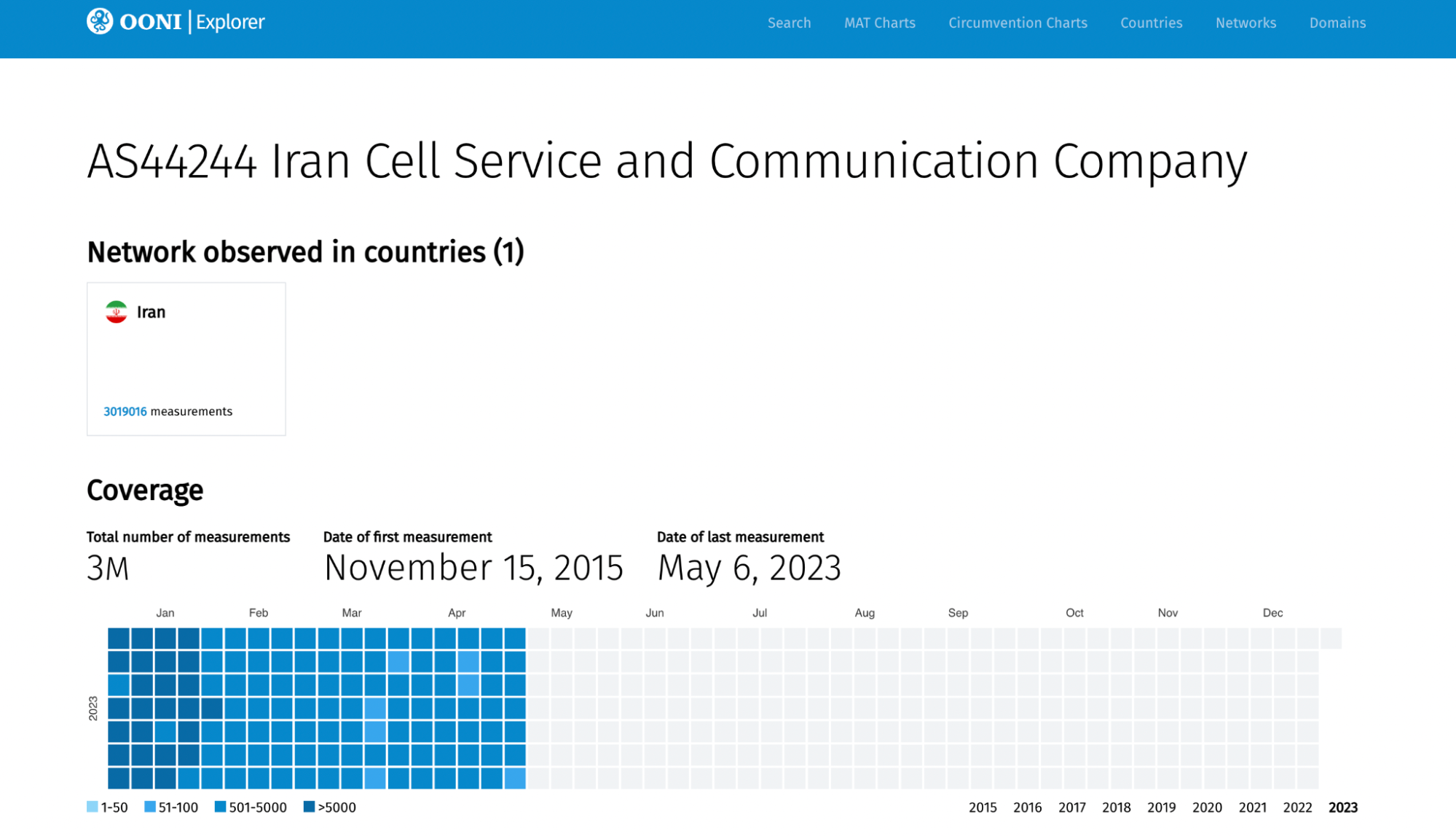Image: OONI Explorer network-centric page for AS44244 Iran Cell Service and Communication Company (source: OONI Explorer).