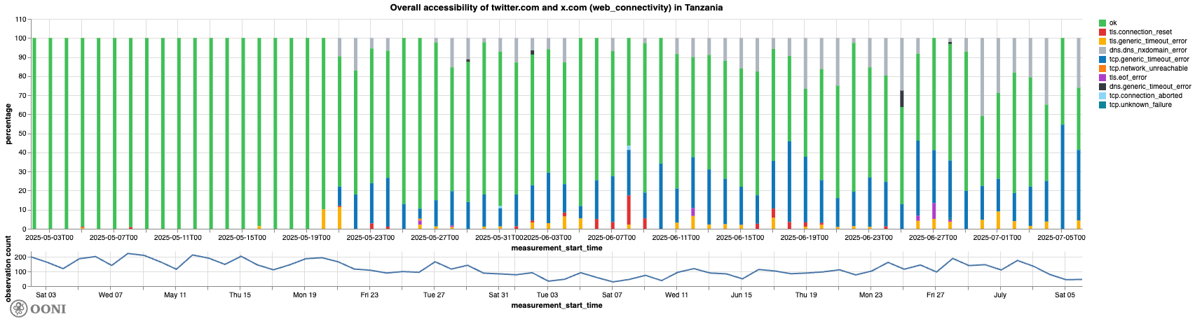 OONI data suggests that access to the social media platform X has been blocked in Tanzania since 20th May 2025.