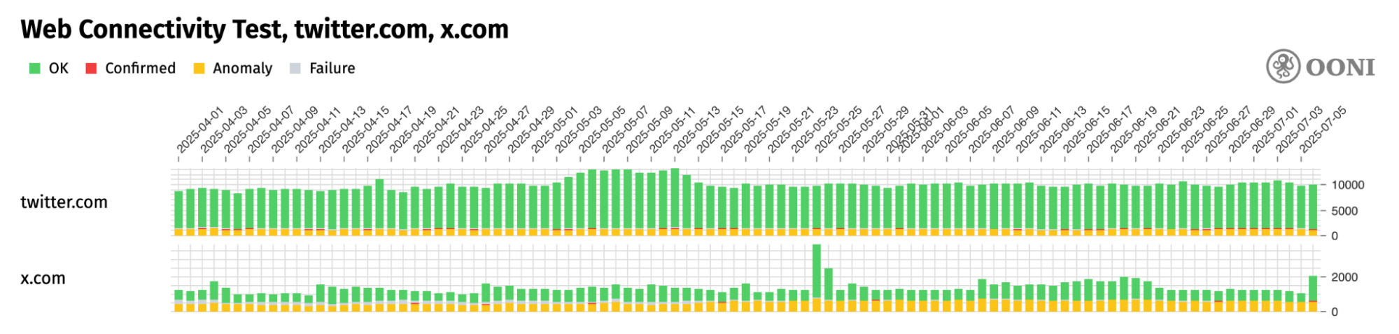 As shown in the chart above, OONI Probe testing for twitter.com began to show a sharp increase in anomalies starting on 20th May 20 2025, suggesting potential blocking. These anomalies persisted and aligned closely with the timeframe reported by news media regarding the platform’s restriction. Although x.com received significantly less testing coverage compared to twitter.com, it also displayed a sustained spike in anomalies during the same period, suggesting a similar disruption.