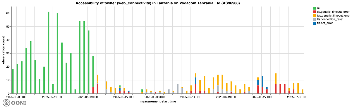 Also starting from 20th May 2025, OONI data shows sustained presence of failures in the testing of X domains (twitter.com and x.com) on Vodacom Tanzania Ltd (AS36908). Many of these failures are TCP timeout errors, suggesting an IP-level block, while some of these failures also suggest TLS level interference.