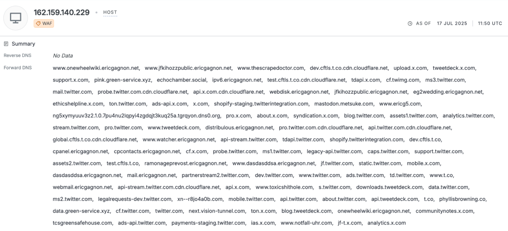 Image: Forward DNS for 162.159.140.229 as of 17th July 2025 (source: censys).